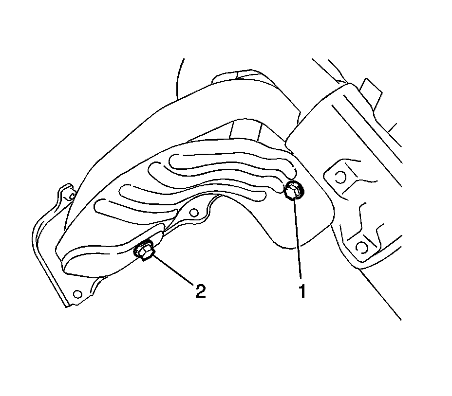 2. Install the exhaust manifold heat insulator with the 2 bolts (1, 2) and tighten to 12 Nm (9 lb ft).