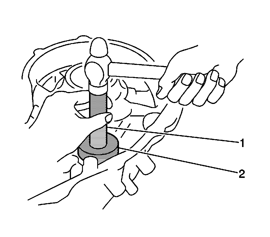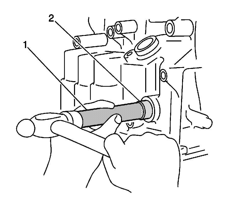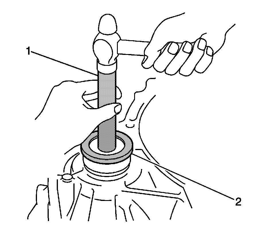 5. Using a suitable tool (1, 2), install the front differential drive pinion gear outer bearing to the transmission case.