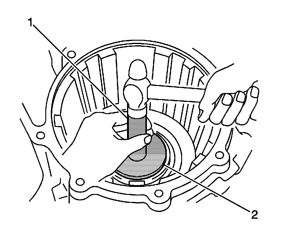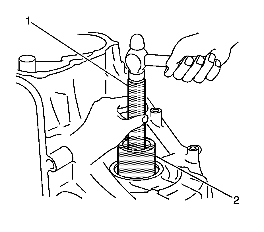 13. Using a J 37358-1/J 37358-2 (1, 2), install the output gear bearing outer race to the transmission case.