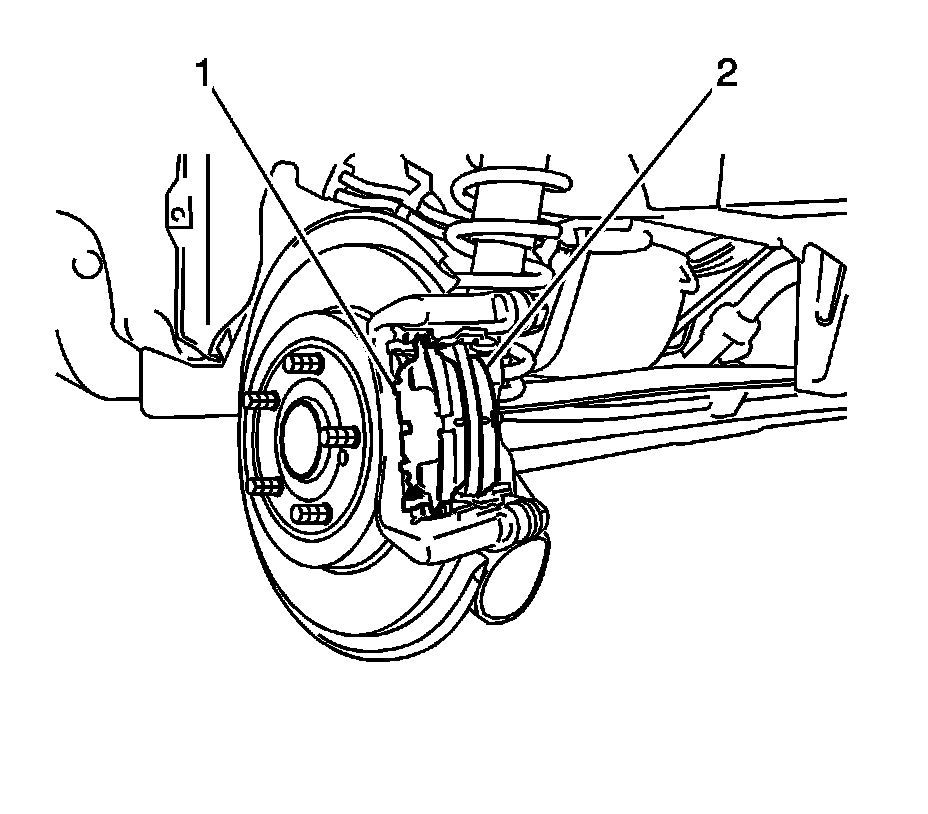 Caution: Support the brake caliper with heavy mechanic wire, or equivalent, whenever it is separated from its mount and the hydraulic flexible brake hose is still connected. Failure to support the caliper in this manner will cause the flexible brake hose to bear the weight of the caliper, which may cause damage to the brake hose and in turn may cause a brake fluid leak.