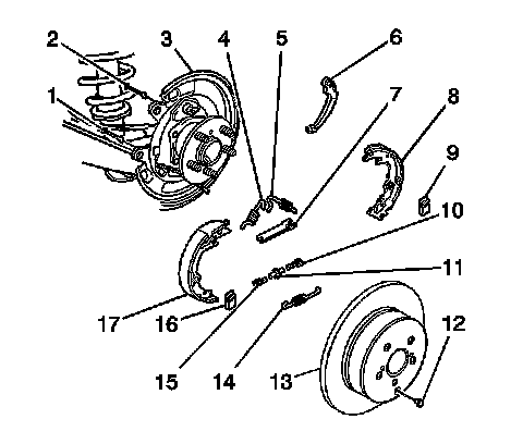 3. Remove the park brake hardware with the park brake shoes. Refer to Parking Brake Shoe Replacement (All Wheel Drive and GT) ().
