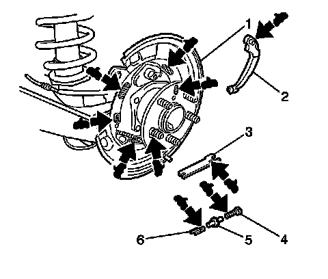 2. Apply high temperature lubricant to the metal contact points on the rear brake shield and on the adjuster (4, 5, 6).