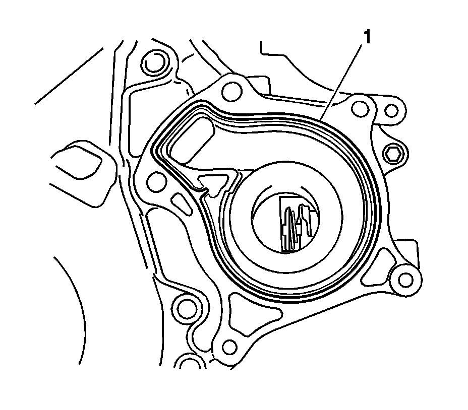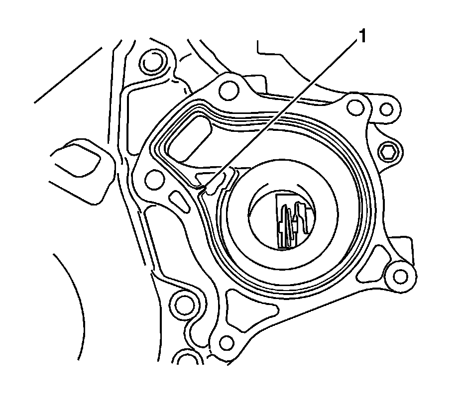 1. Align the protrusion (1) of a new water pump gasket with the cutout in the timing chain cover and install the gasket to the groove of the timing chain cover.