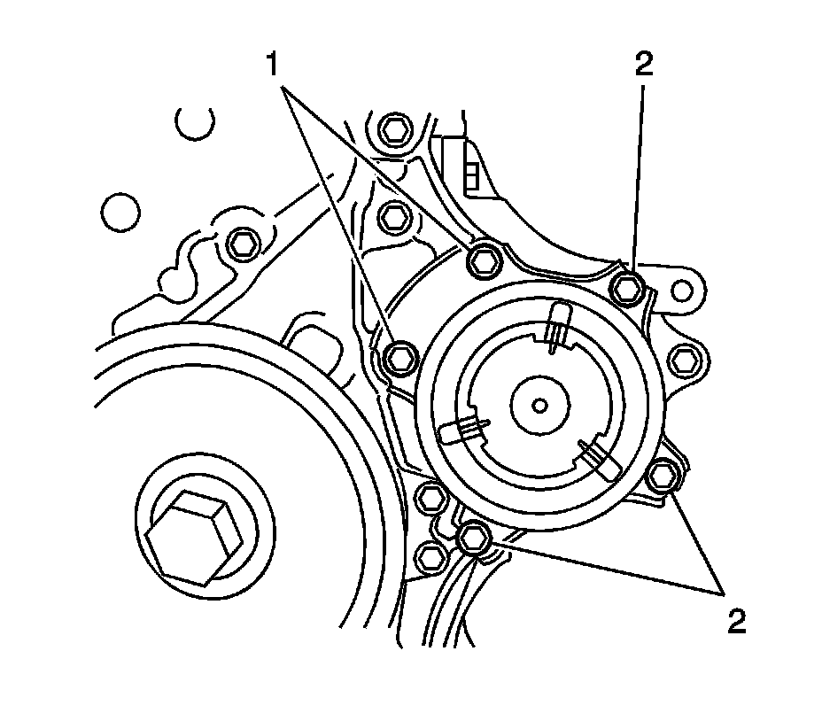 2. Install the water pump assembly to the timing chain cover with the 5 bolts (1, 2) and tighten.
