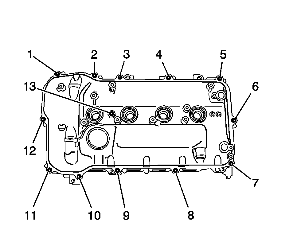 3. Install the cylinder head cover with a new seal washer and the bolts (1-13) and tighten to 10 Nm (7 lb ft).