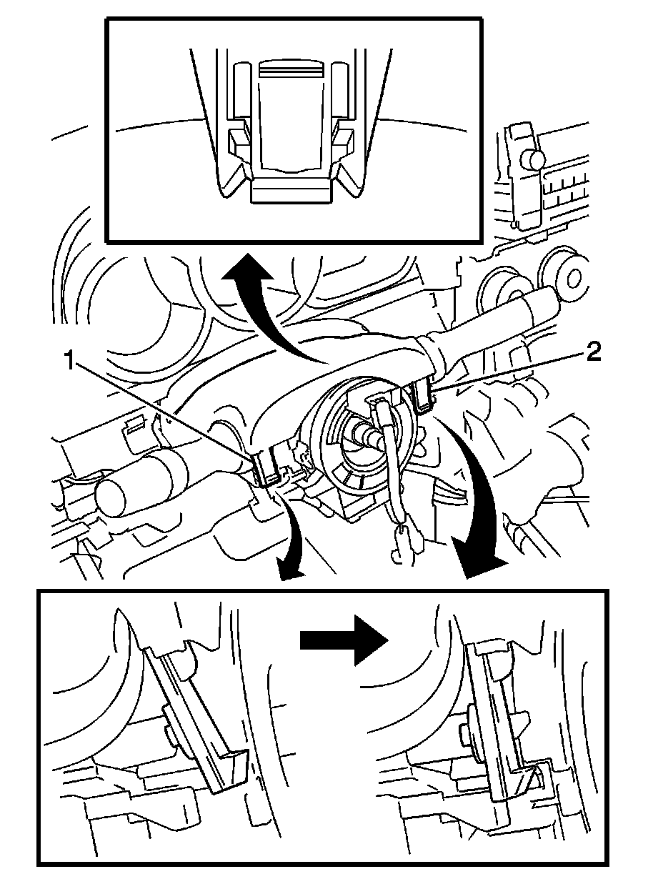 1. Engage the claws (1, 2) and install the upper steering column trim cover to the steering column.