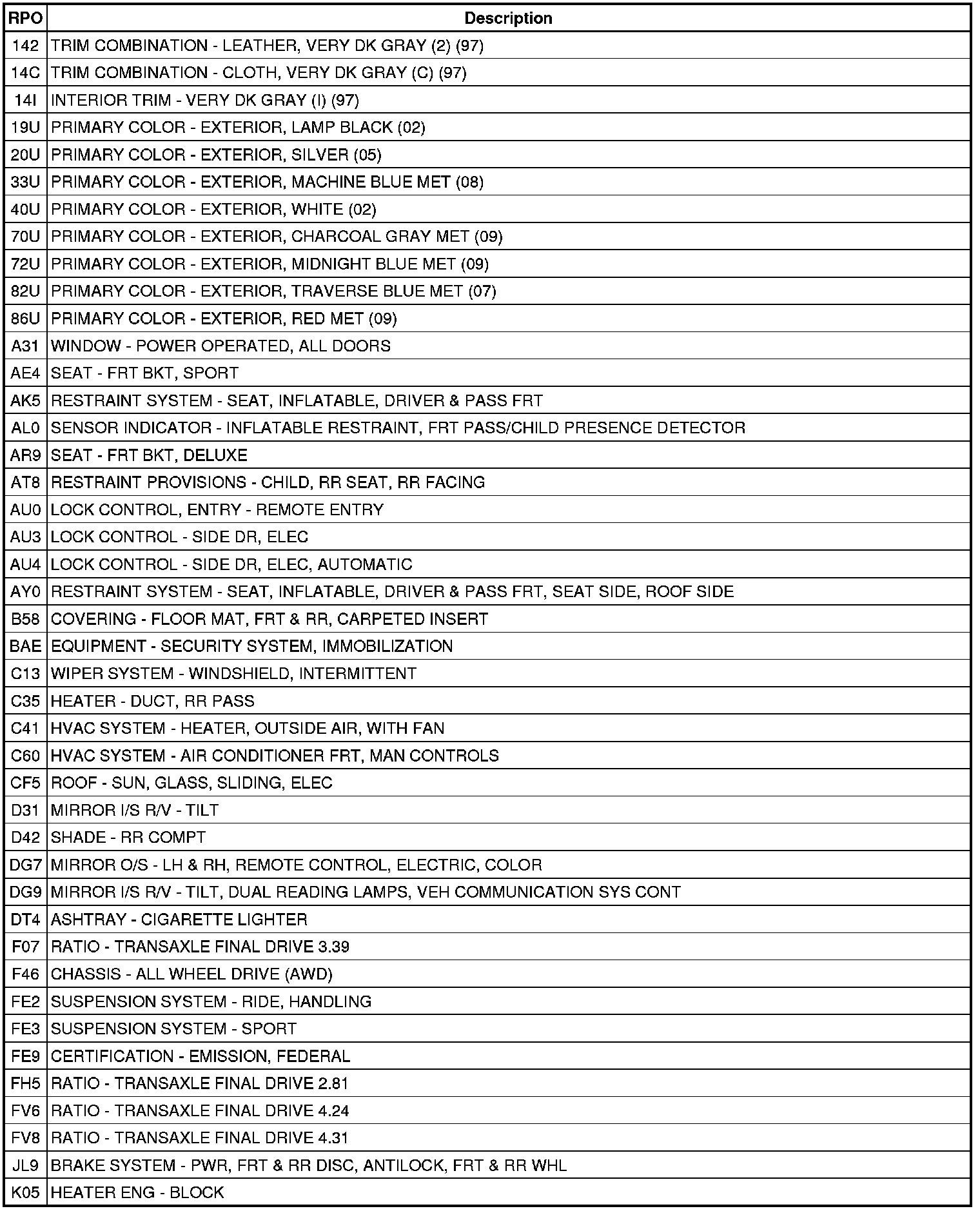 RPO Code List