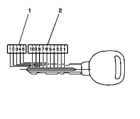 If the code numbers are not available from the records or from the tags, the key code can be obtained from the right-side door lock cylinder (if the key has not been replaced). Lock cylinders supplied by the factory as service parts are unmarked. If the original key is available, the key code cutting combination can be determined by laying the key on the key code diagram.