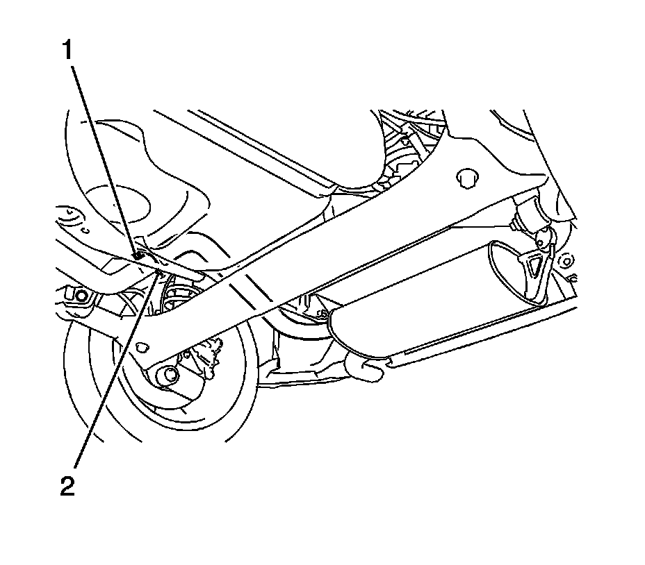 5. Install the muffler assembly with the 2 bolts (1) and 2 compression springs (2). Tighten the bolts to 43 Nm (32 lb ft).