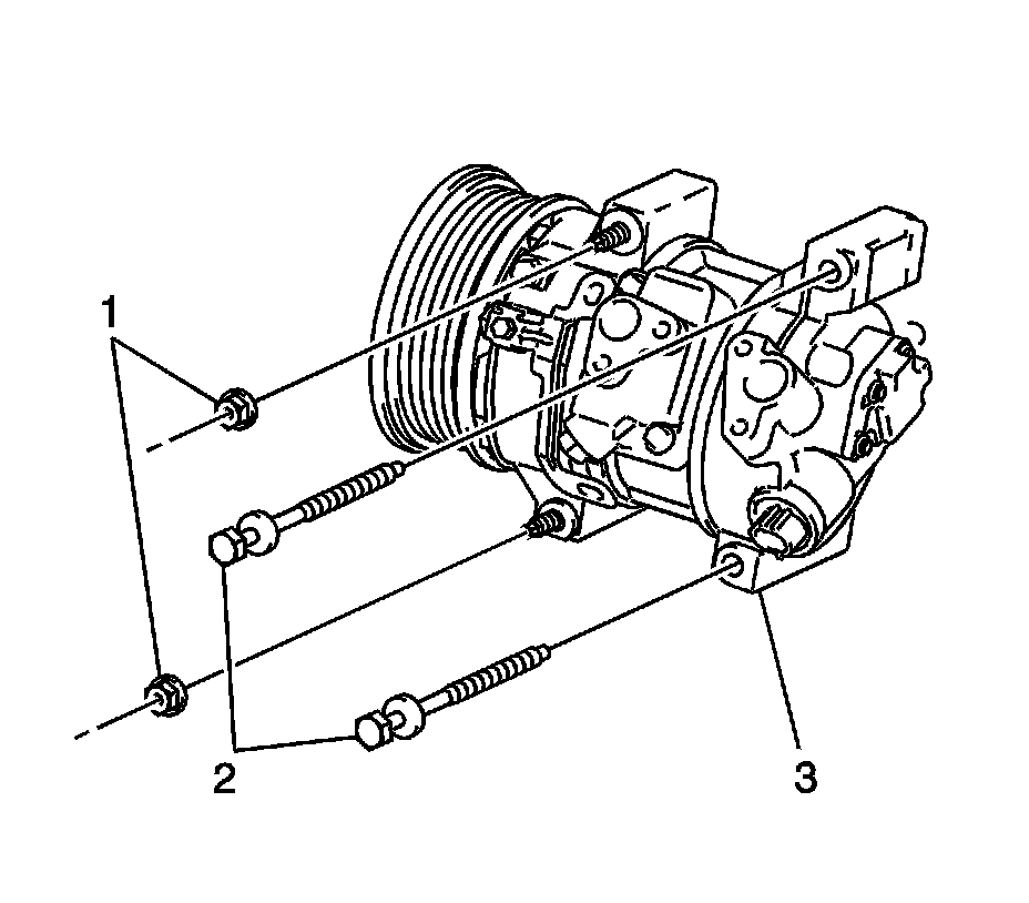 11. Remove the two nuts (1) from the compressor (3).