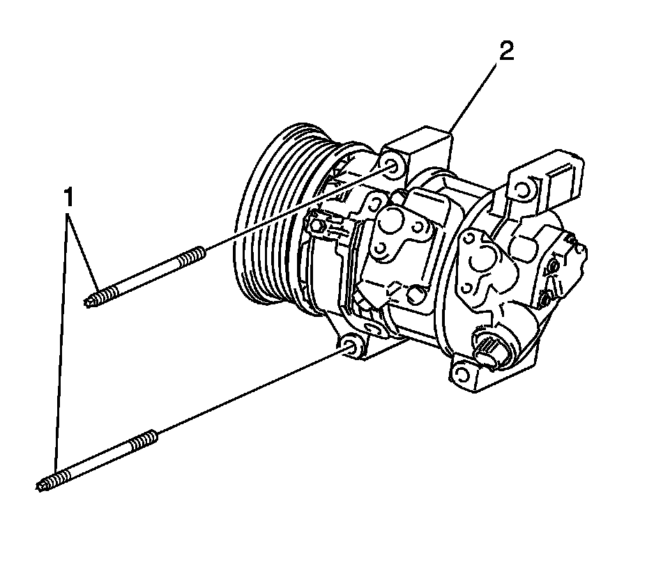 5. Install the two stud bolts (1) and the compressor (2) to the vehicle.