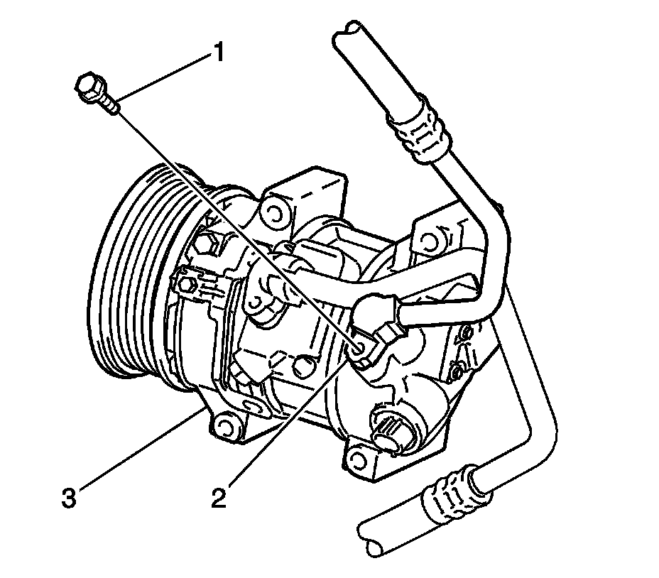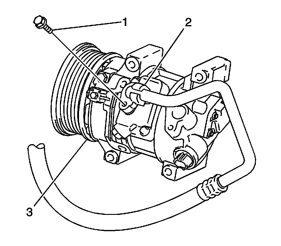 6. Remove the bolt (1) and disconnect the discharge hose assembly (2) from the compressor (3).