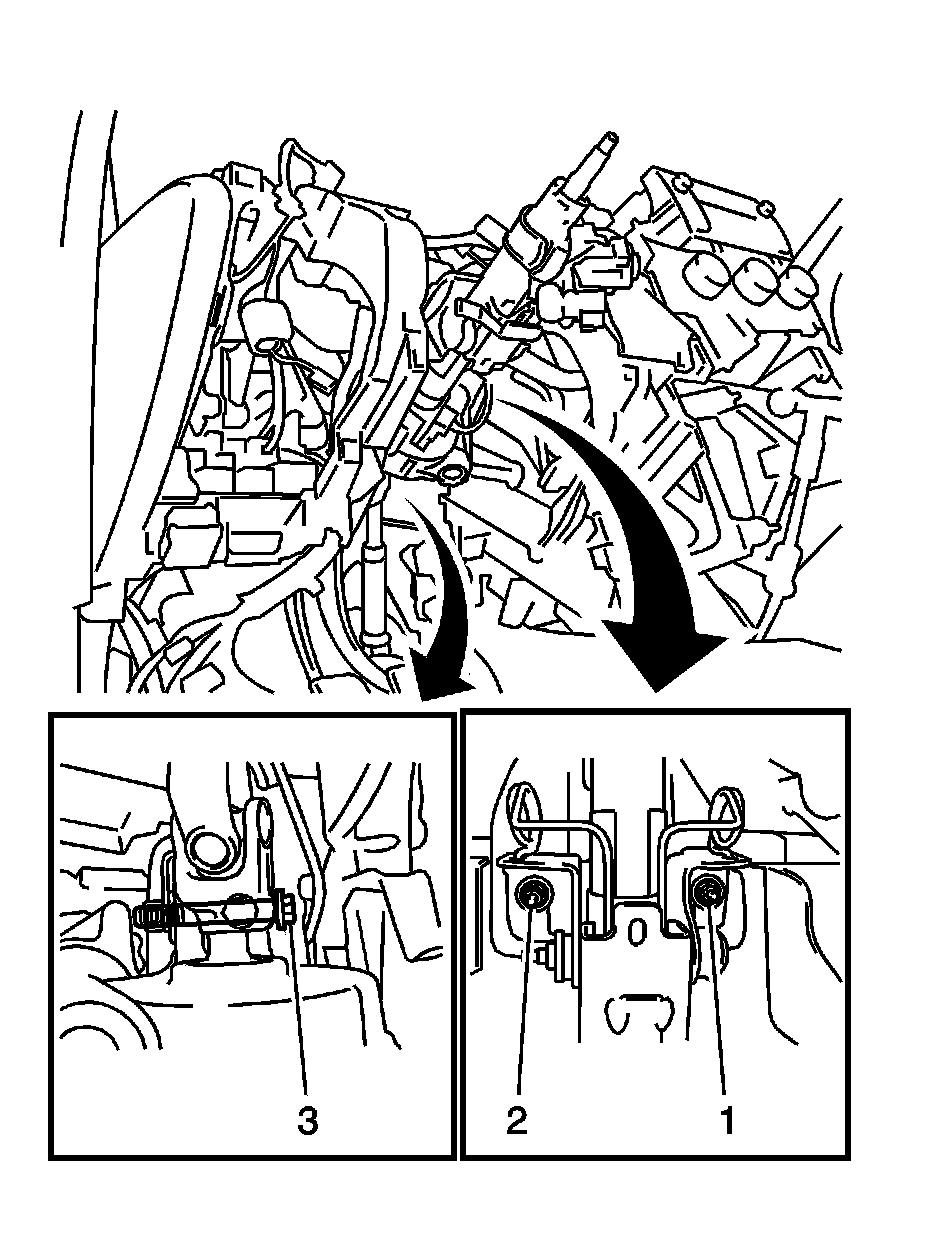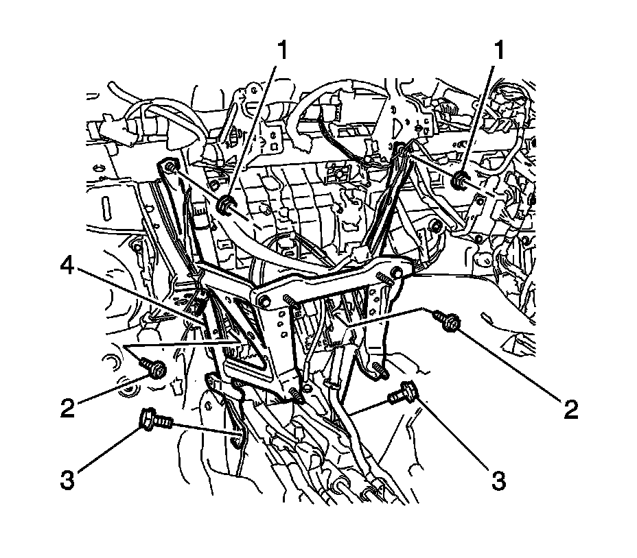 9. Install the HVAC module nut (2) and bolt (3), do not tighten at this time.
