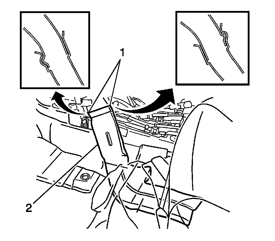 14. Disengage the two clips (1) and remove the passenger side rear air duct (2).