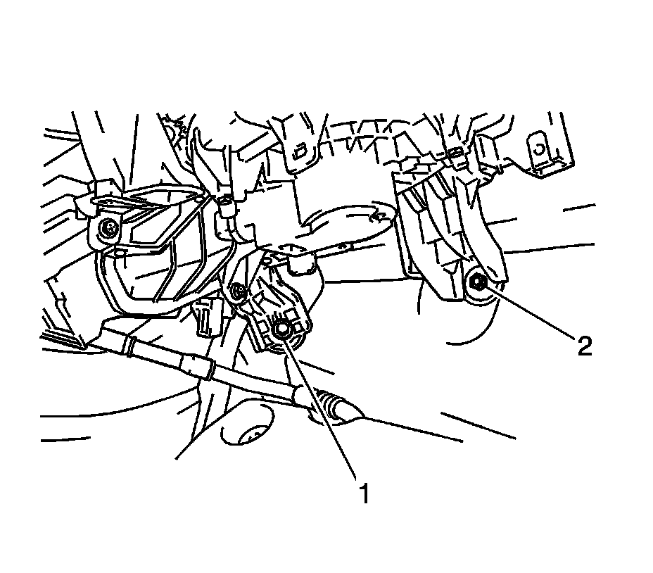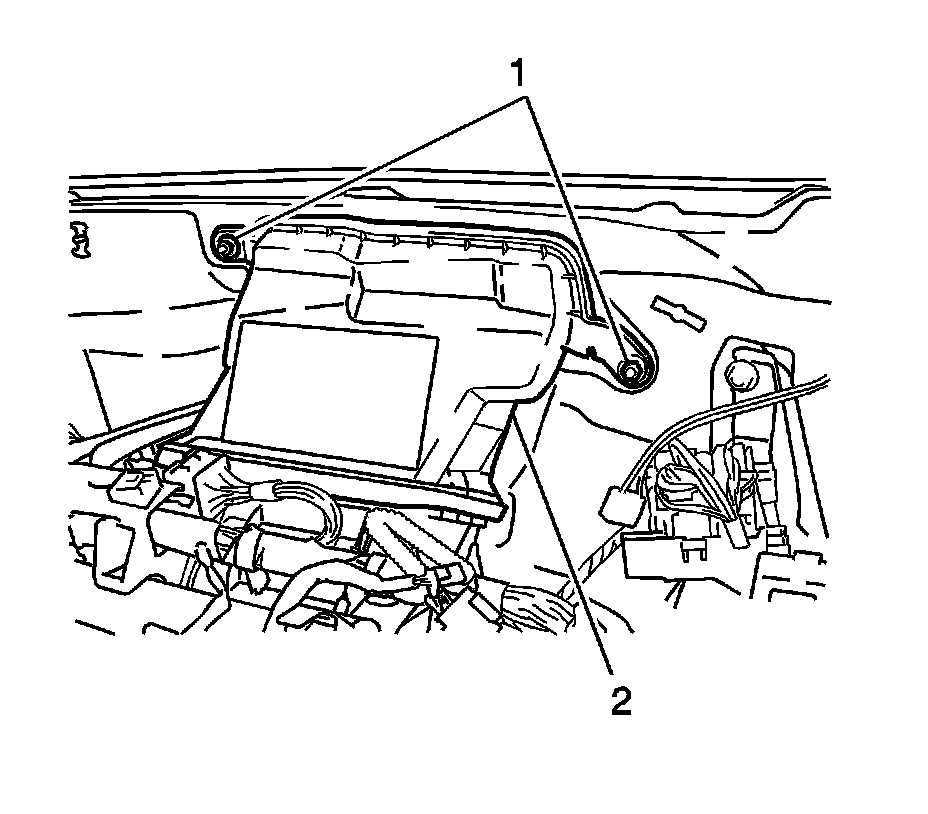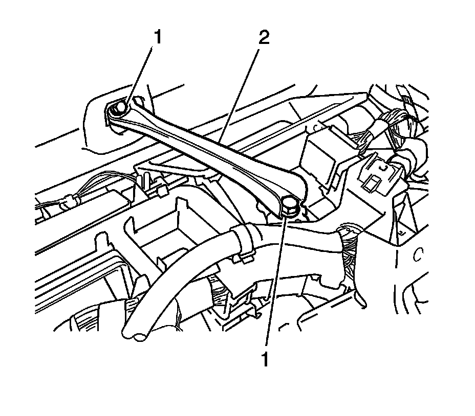 19. Remove the two bolts (1) and the center instrument panel to cowl brace (2).