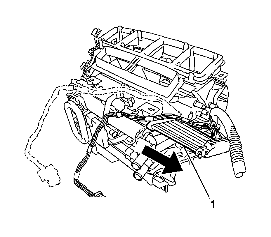 50. Remove the PTC quick heater (1) from the HVAC module, if equipped.