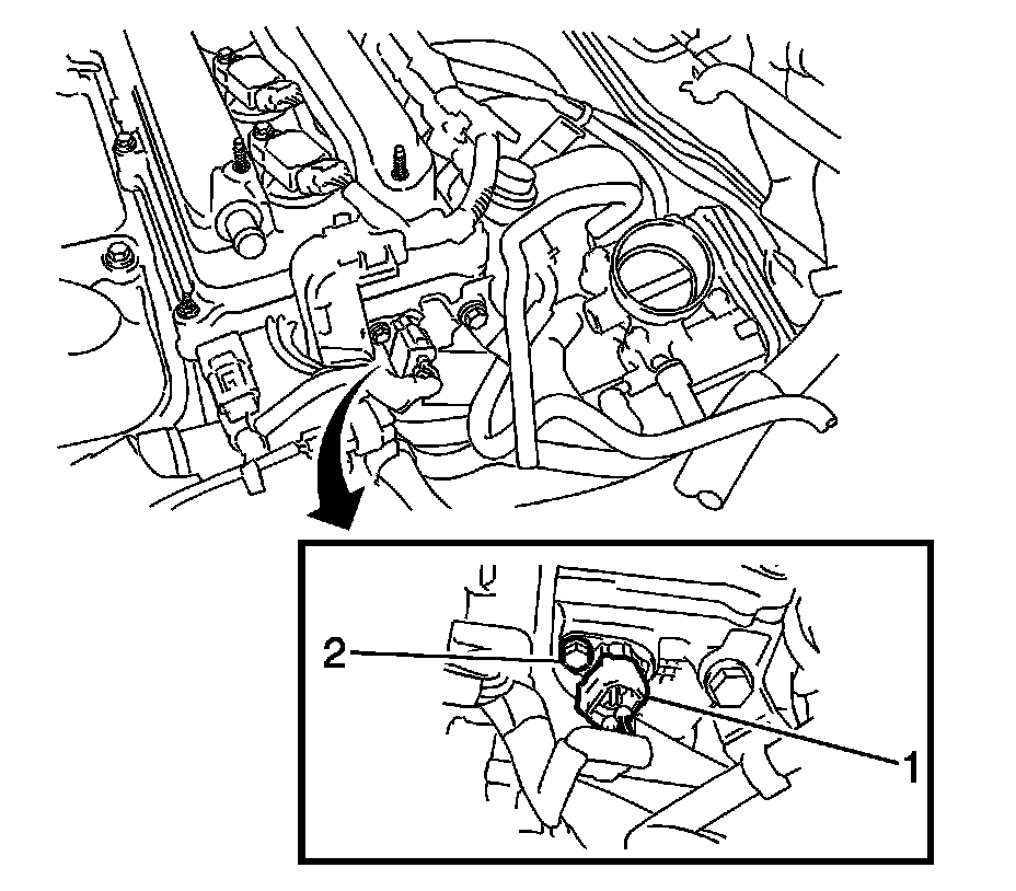 2. Install the camshaft position sensor with the bolt (2) and tighten to 9.0 Nm (80 lb in).