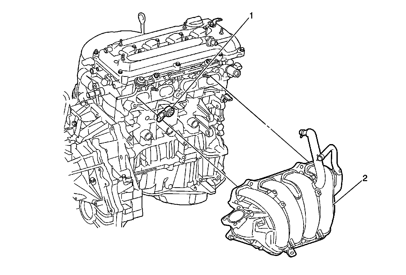 The knock sensor (KS) (1) is located below the intake manifold (2), on the engine block between cylinder 2 and cylinder 3. The KS detects engine detonation and sends a signal to the PCM. The PCM uses the input from the KS to adjust the ignition timing in order to control detonation. For detailed information on the operation of the KS refer to Knock Sensor System Description (Description and Operation).
