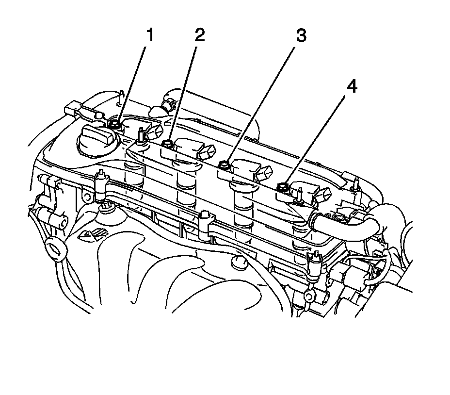 1. Install the 4 ignition coils with the 4 bolts (1, 2, 3, 4) and tighten to 9.0 Nm (80 lb in).