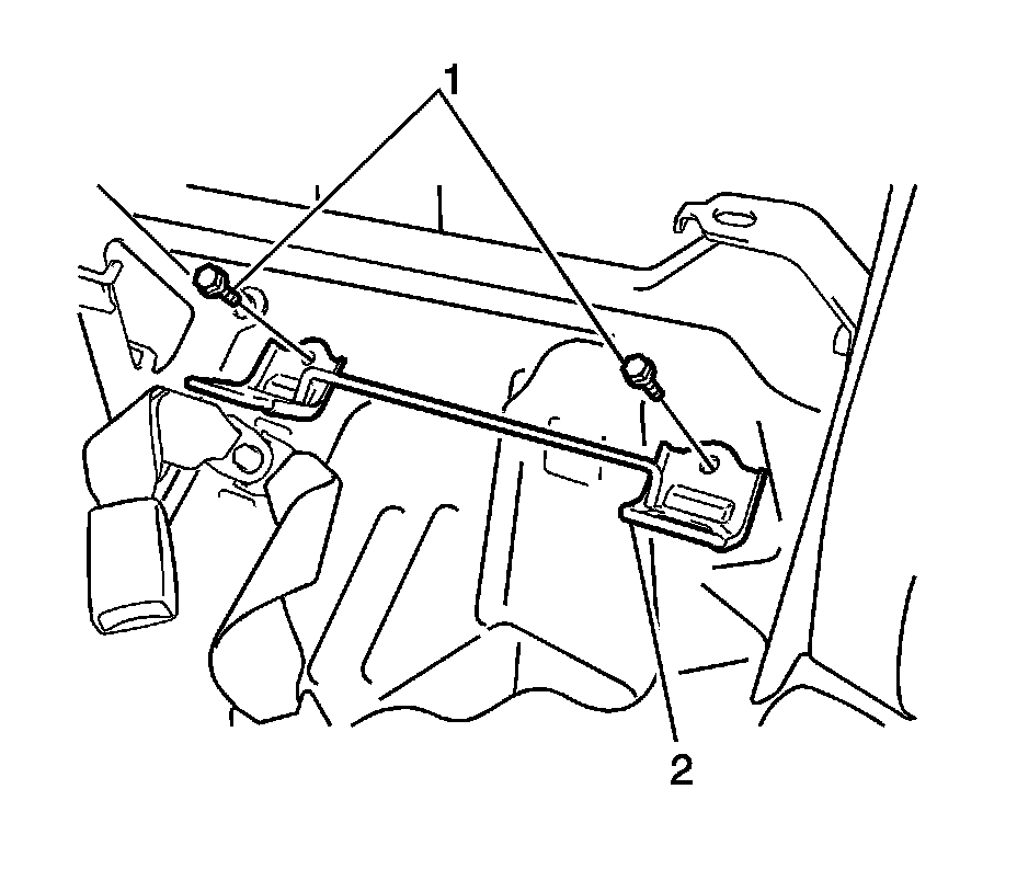 The vehicle is also equipped with a lower child seat anchor bracket (2) for each rear seat position. The lower brackets (2) are located below the rear seat back cushion, behind the rear seat cushion.