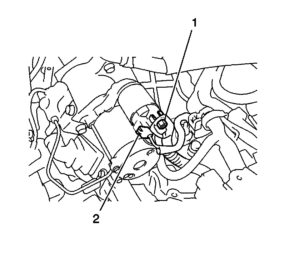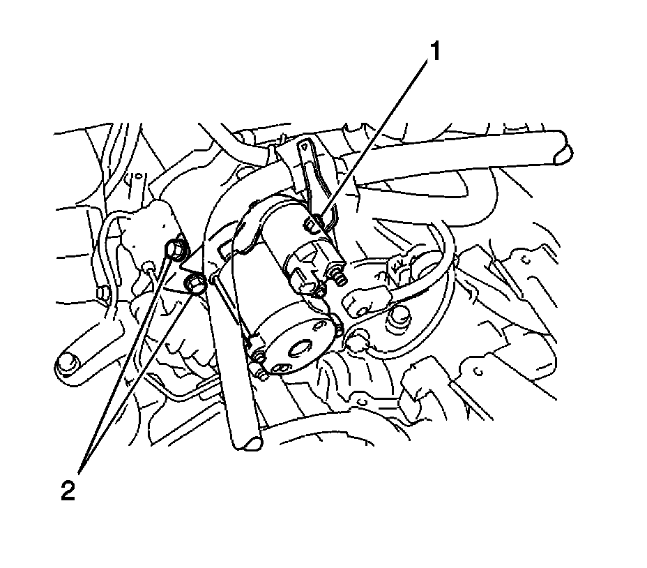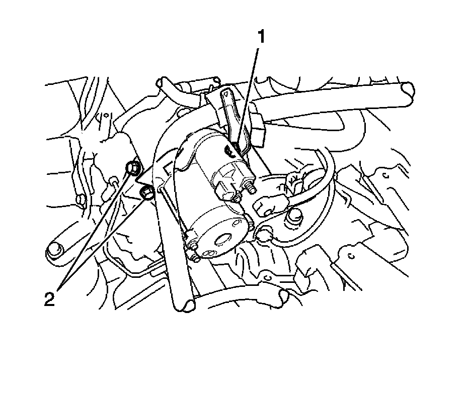 13. Remove the 2 bolts (1, 2), wire harness clamp bracket and starter assembly.