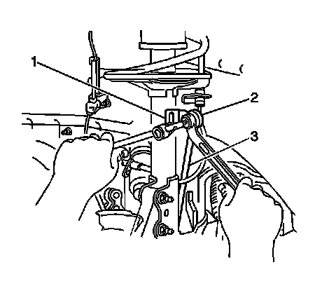 3. Use a 6 mm wrench in order to hold the stabilizer shaft link upper stud. Remove the nut from the stud in order to separate the link (3) from the strut bracket (1).