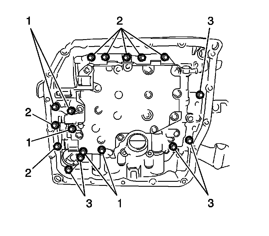 1. Check the manual valve lever position. Install the valve body to the transaxle case with the bolts (1-3) and tighten to 11 Nm (97 lb in). Refer to Transmission General Specifications (Transmission General Specifications) for Bolt Length - E.