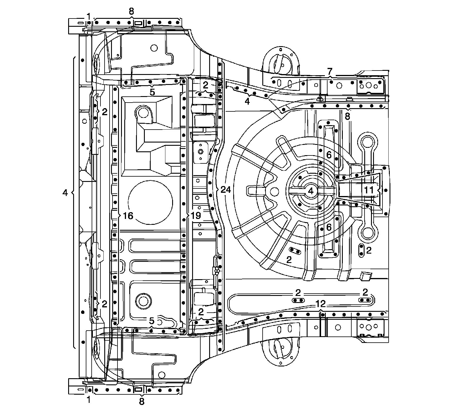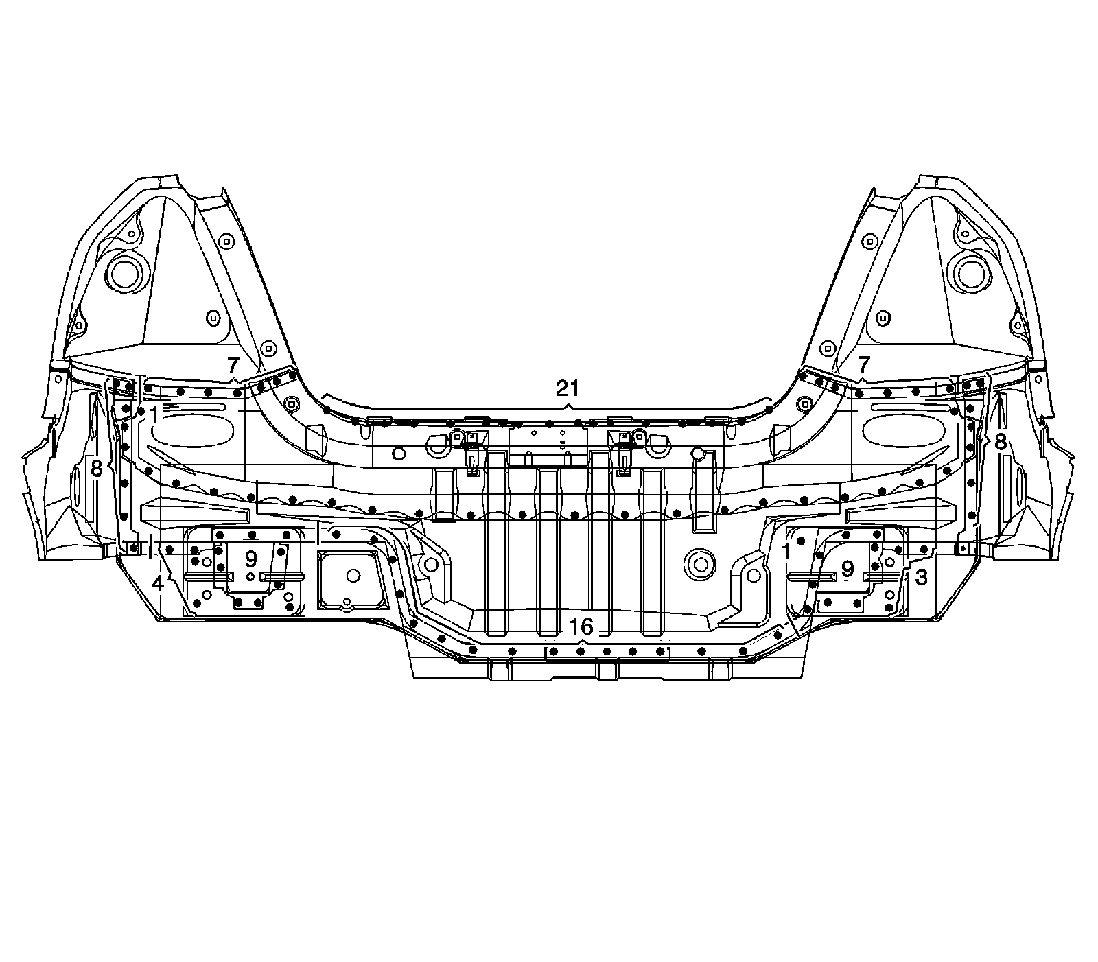 The rear floor panel is the base of the rear body and it is critical for the rigidity of the rear body. During replacement, refer to Dimensions - Body () to determine the position to set the rear floor properly.
