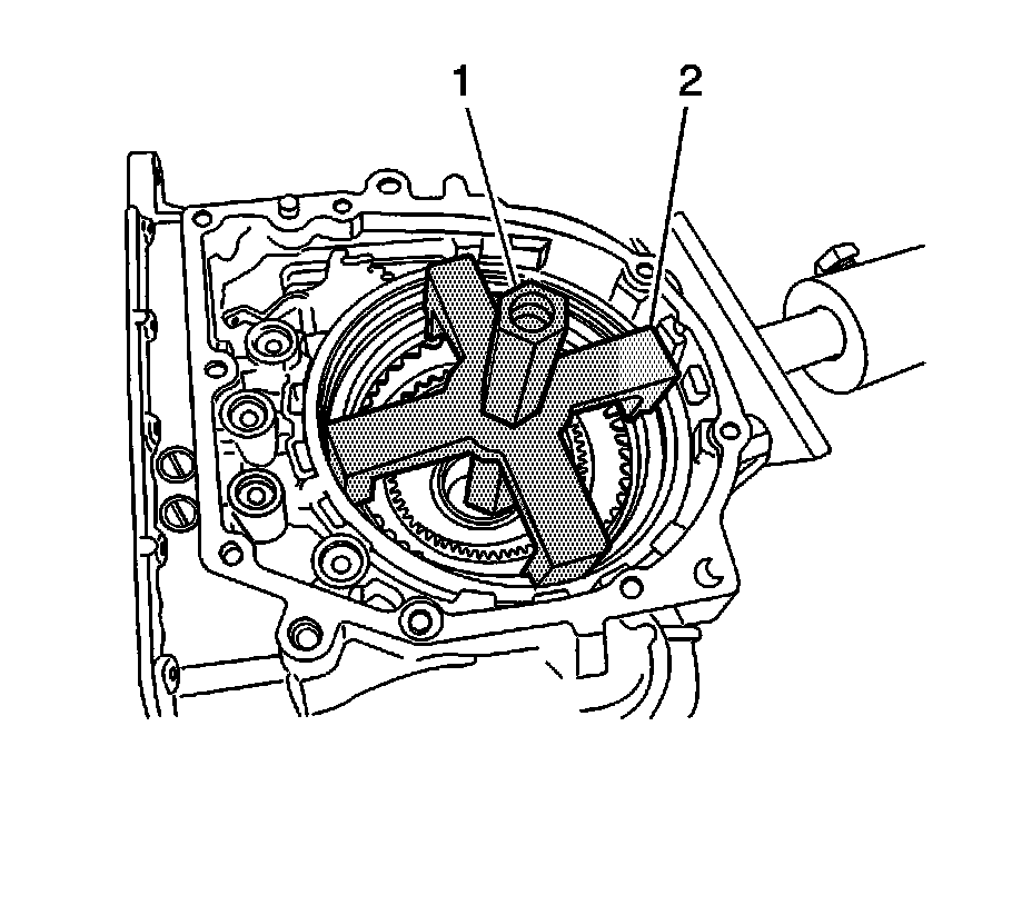 74. Using DT 46455 (1) and DT 46457 (2), remove the snap ring of 1st and reverse brake.