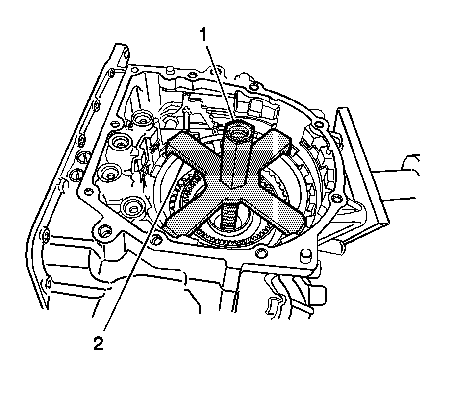 58. Using DT 46455 (1) and DT 46458 (2), remove the 2 snap rings, 2nd brake piston, and 2nd brake piston return spring.