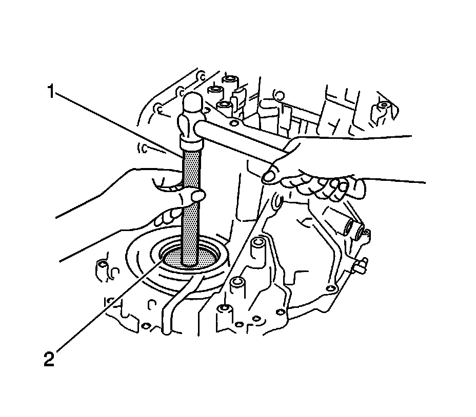 84. Using DT 46463 (2) and DT 46465 (1), remove the transaxle case side bearing outer race and shim.