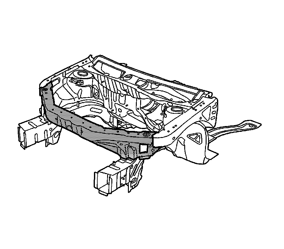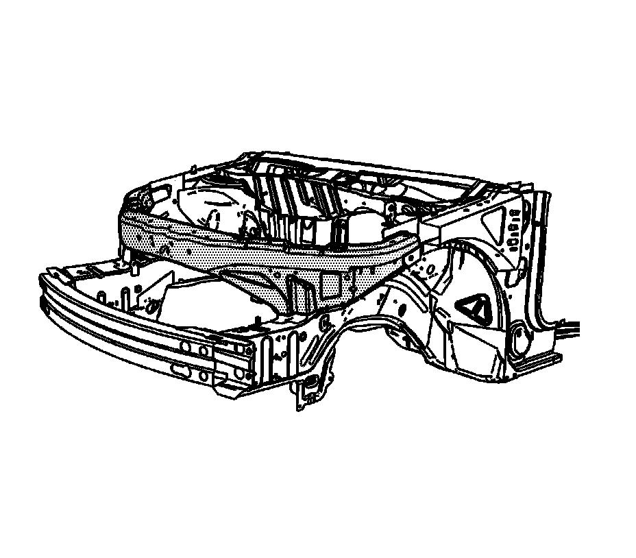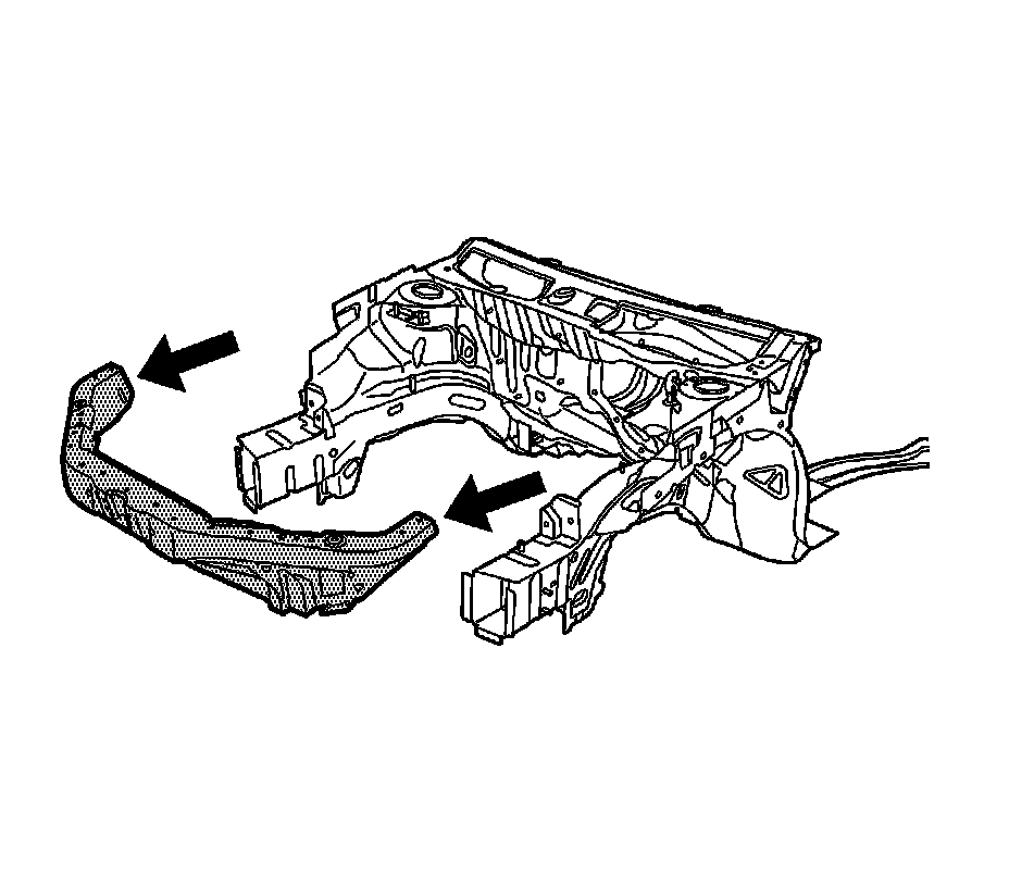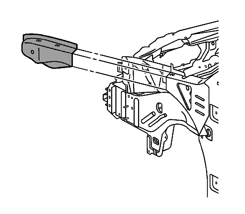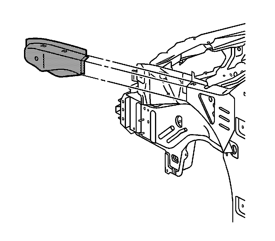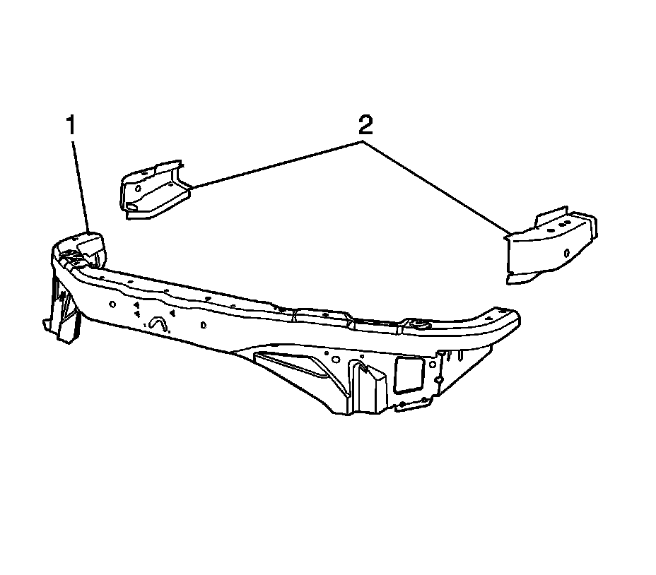 Note: Replacement of the tie bar requires partial removal of the upper side rails. The tie bar (1) and upper side rail service parts (2) are included in a kit for efficient installation. If the damage permits, locate and remove the front portion of the upper side rails in the location described in this procedure, and install the upper side rail service parts. If the damage does not permit the use of the upper side rail service parts (2), the entire upper side rail must be replaced. This procedure must be performed on both sides of the vehicle. The procedure below only illustrates the driver's side.