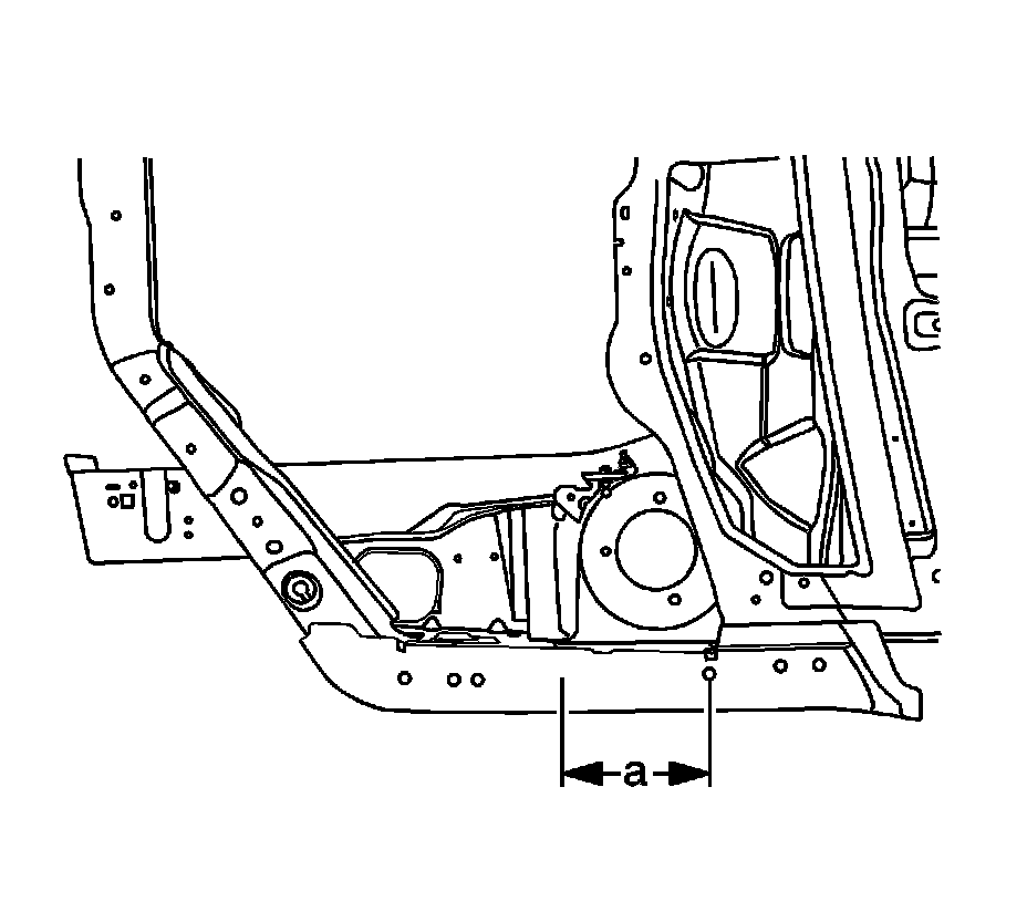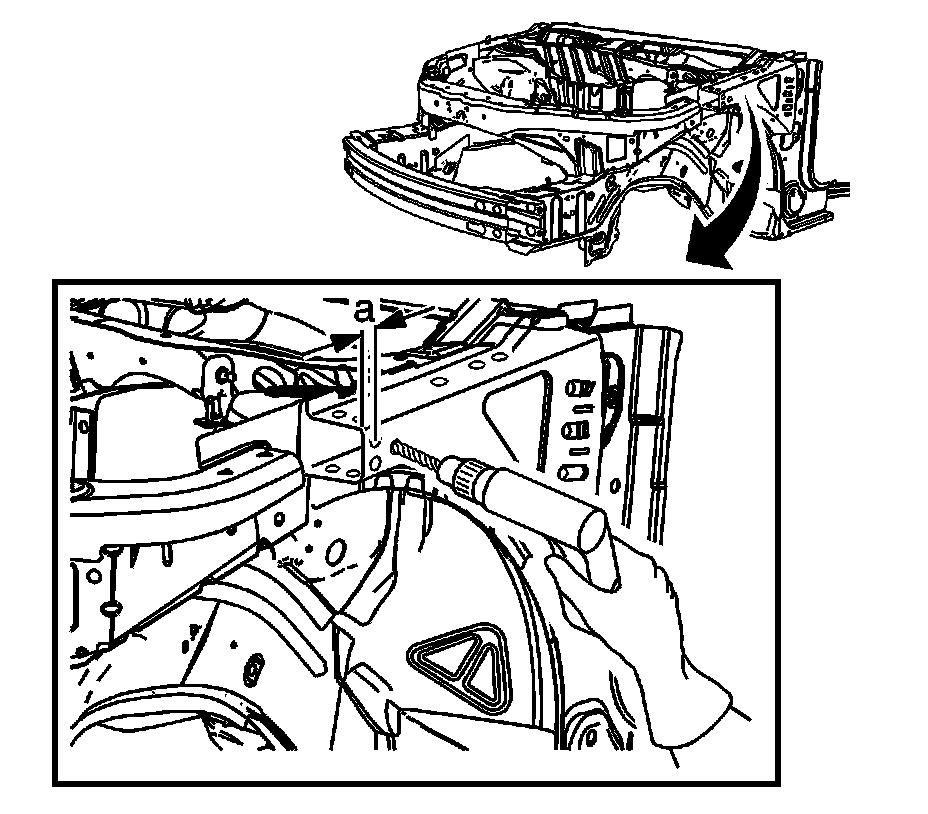 6. On the driver side upper side rail, measure (a) 225 mm (8 7/8 in) from the center forward hood hinge mounting hole. Scribe a line.