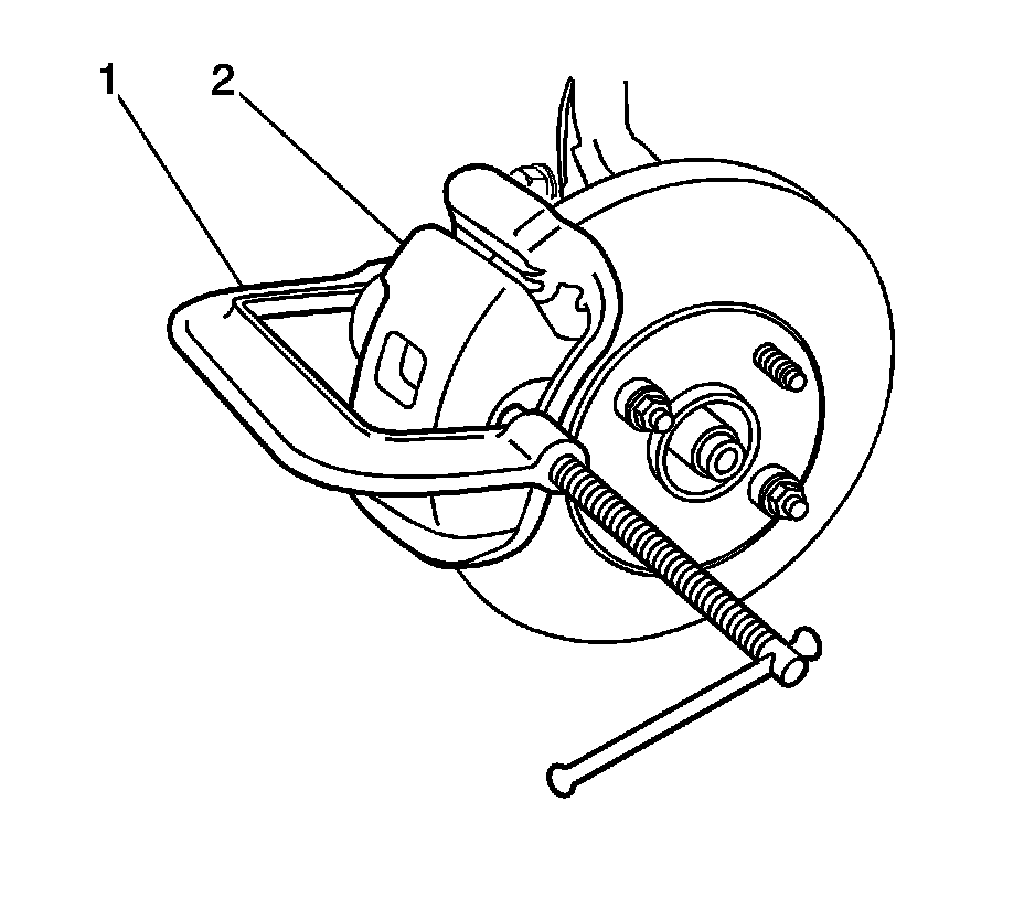 7. Install a large C-clamp (1) over the body of the brake caliper (2) with the C-clamp ends against the rear of the caliper body and against the outboard brake pad.