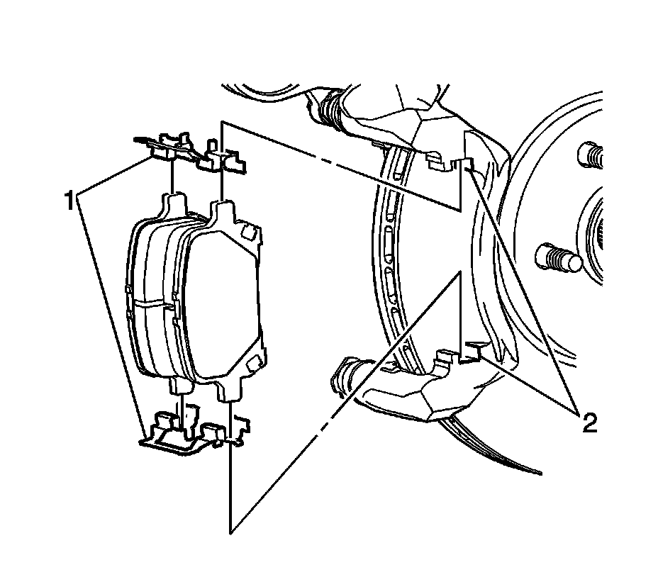 1. Apply a very thin coating of high temperature silicone brake lubricant to the pad hardware mating surfaces of the caliper bracket (2) only.