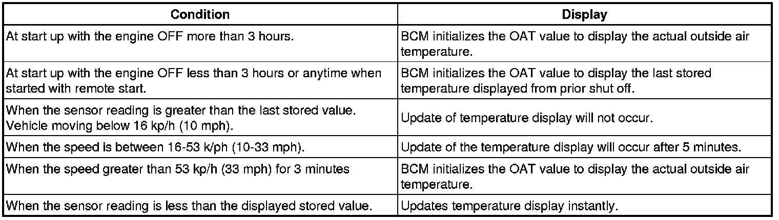The Radio/IPC displays the outside air temperature value that it receives through a Low Speed GMLAN message. The scan tool has the ability to update the displayed ambient air temperature. The HVAC Manual Tech 2 shows the ambient air temperature sensor feedback voltage under Body and Accessories / Data Display / BCM. The HVAC Auto System there is a temperature reading under HVAC / Data Display / HVAC / Sensor Data. Both readings are unfiltered so it is possible that the temperature read on the tech 2 will differ from the temperature displayed on the DIC/Radio without there being a problem with the vehicle. The DIC/Radio only displays the reading being sent from the BCM. The outside air temperature value is displayed or updated under the following conditions: