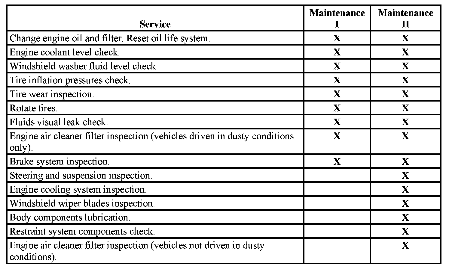 When the Change Oil Soon message displays, certain services, checks, and inspections are required. The services described for Maintenance I should be performed at every engine oil change. The services described for Maintenance II should be performed when:
