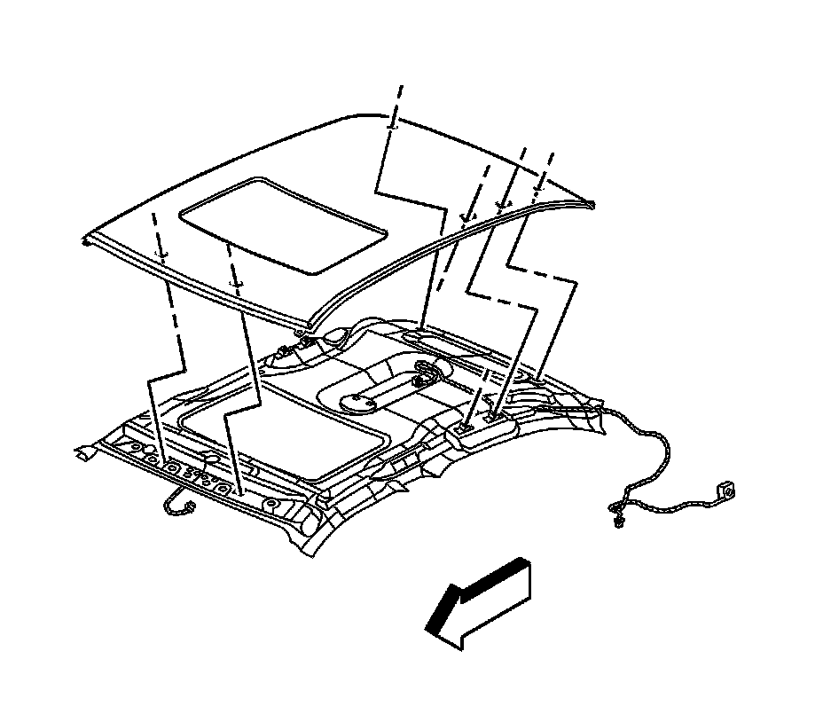 Caution: Use care when removing or installing the headliner. Excessive bending will damage the headliner.