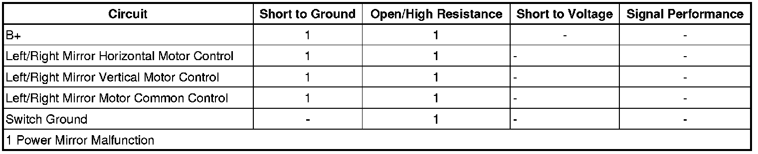 • If the test lamp remains OFF during either of the commands, test for a short to voltage, short to ground or an open/high resistance on the control circuits. If the circuits test normal, replace the power mirror switch.