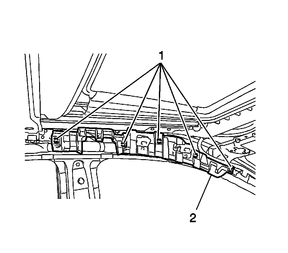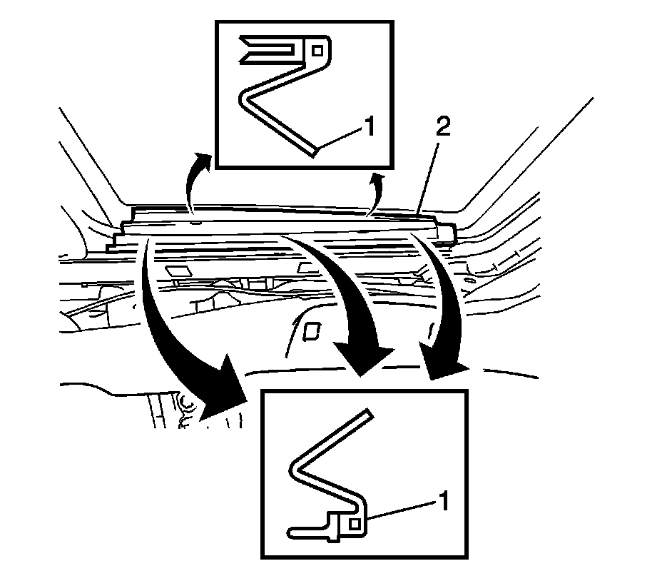 2. Disengage the five clips (1) and remove the front side roof rail spacer (2).
