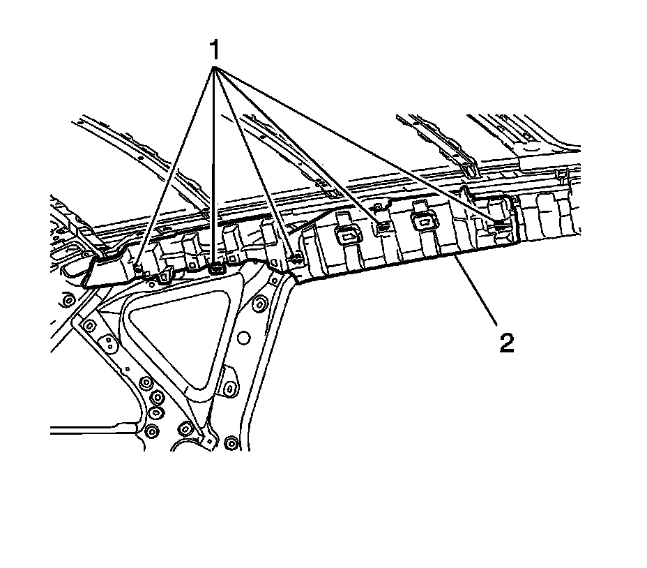 3. Disengage the five clips (1) and remove the rear side roof rail spacer (2).