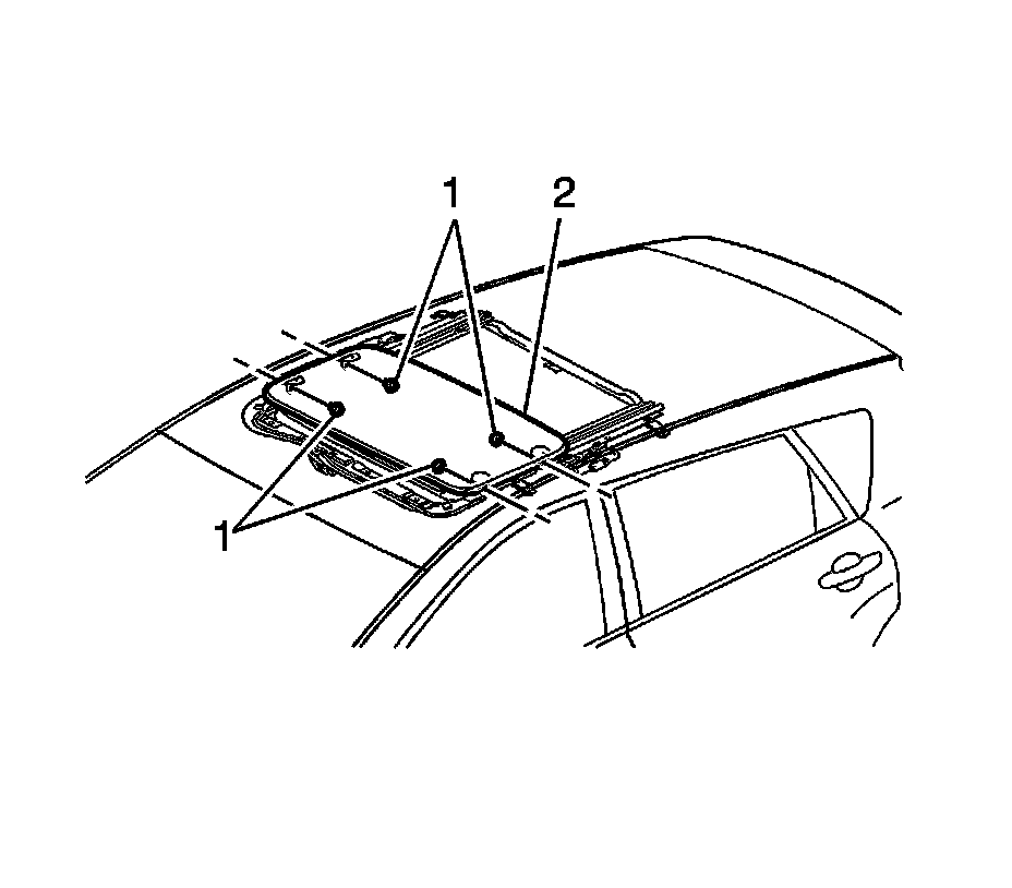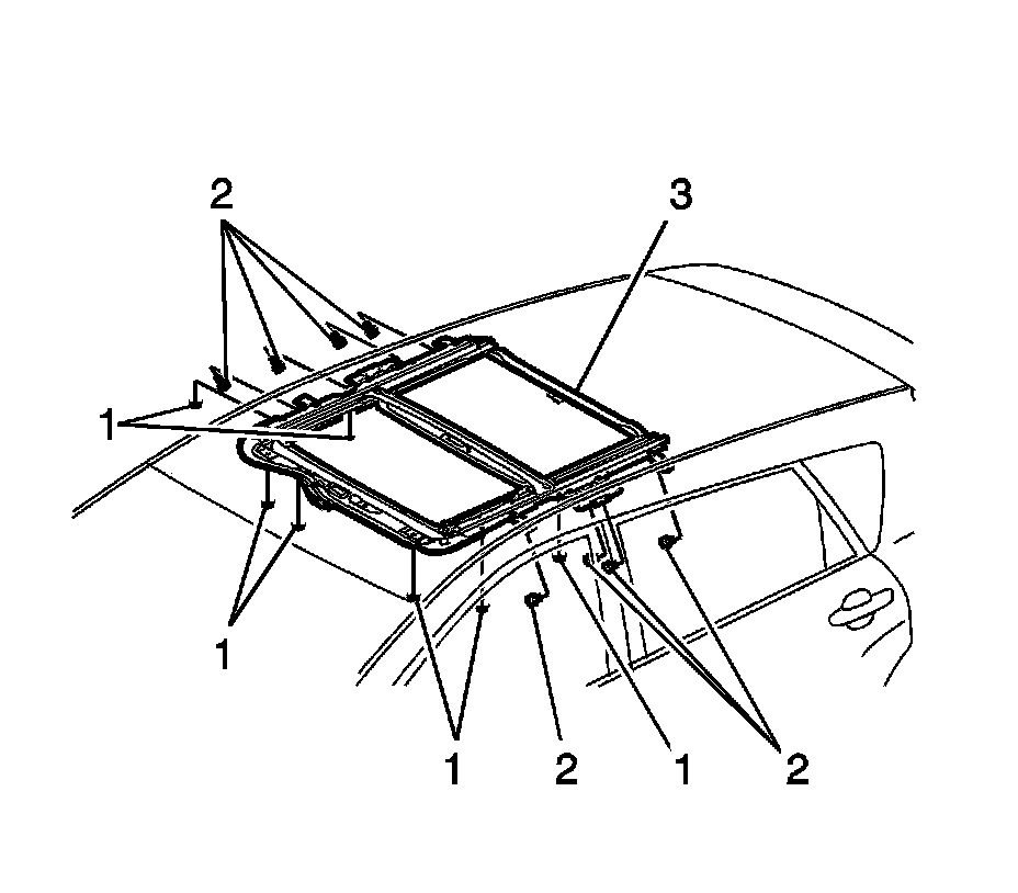 6. Install the sunroof glass panel (2) to the vehicle. Secure the glass panel (2) with two screws (1) at each side. Do not tighten fully.