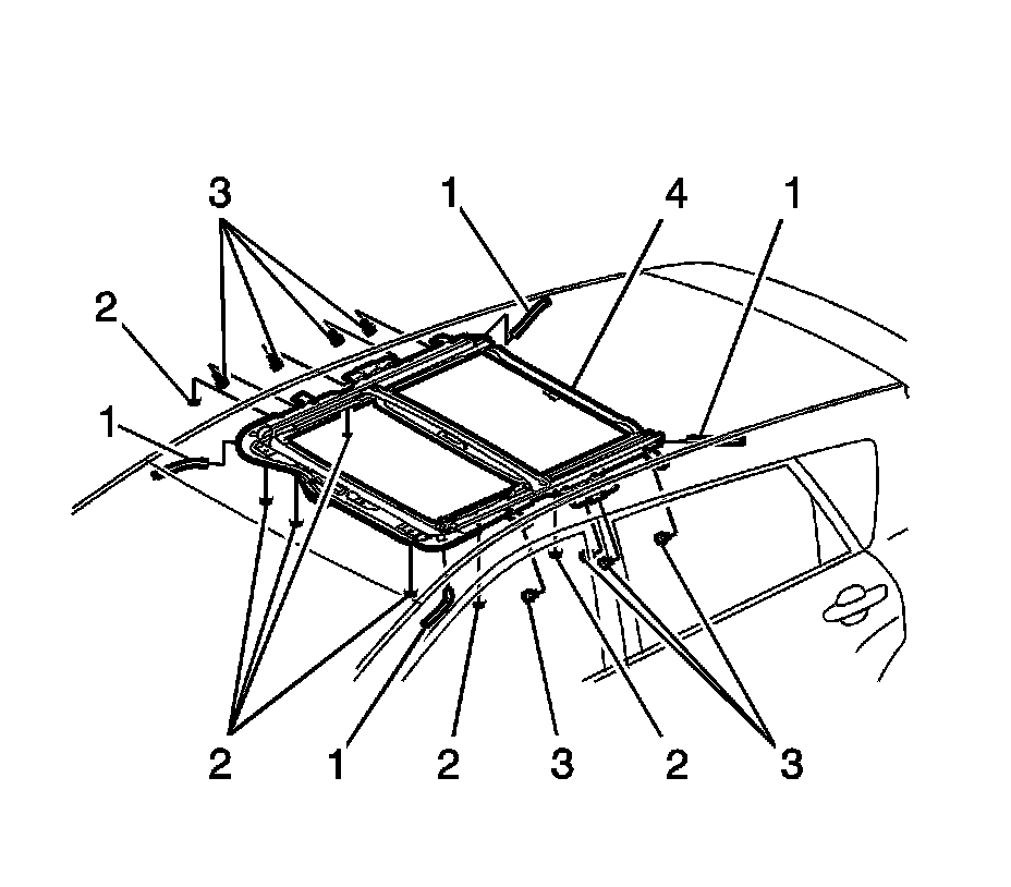 1. Install the sunroof housing assembly (3) to the vehicle.