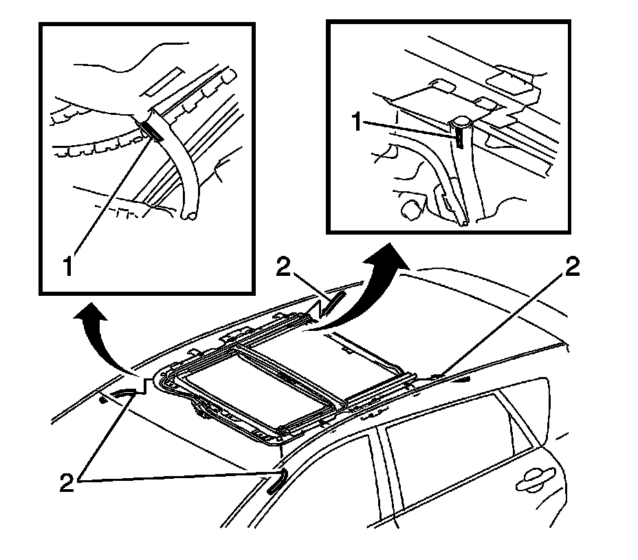 4. Disengage the five clips (1) and remove the sunroof garnish molding (2).