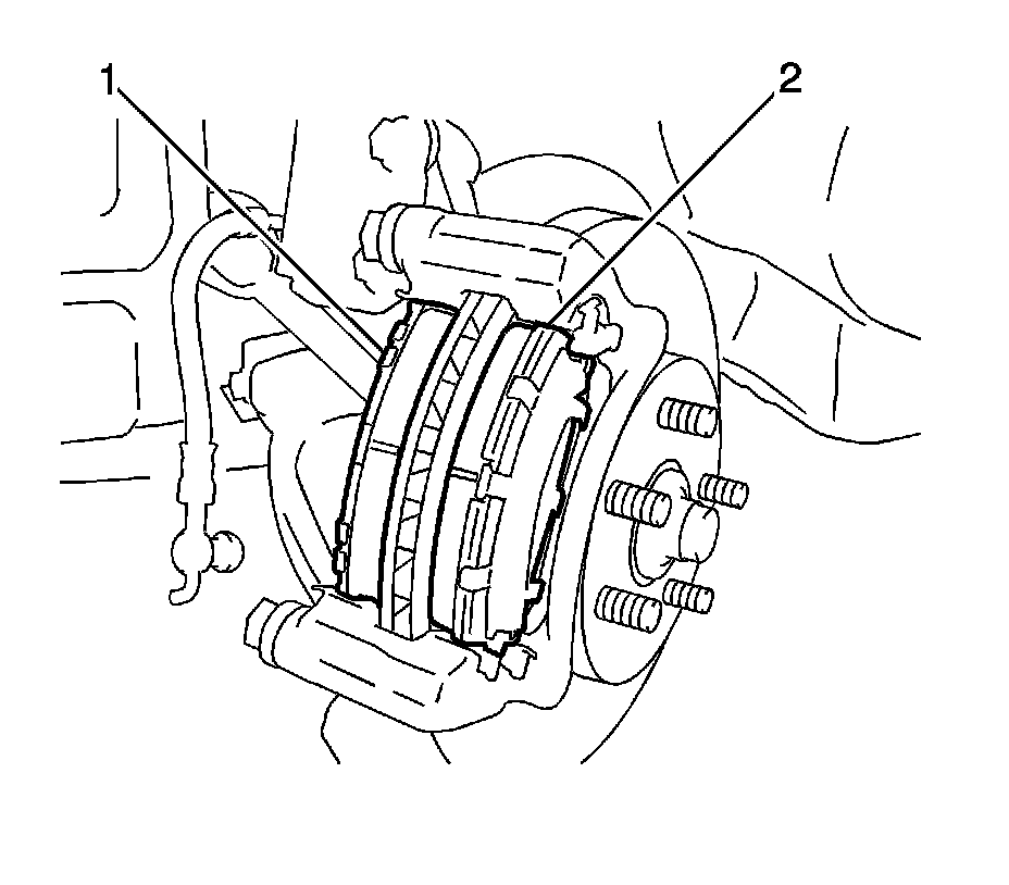 9. Remove the brake pads with the insulators (1, 2).