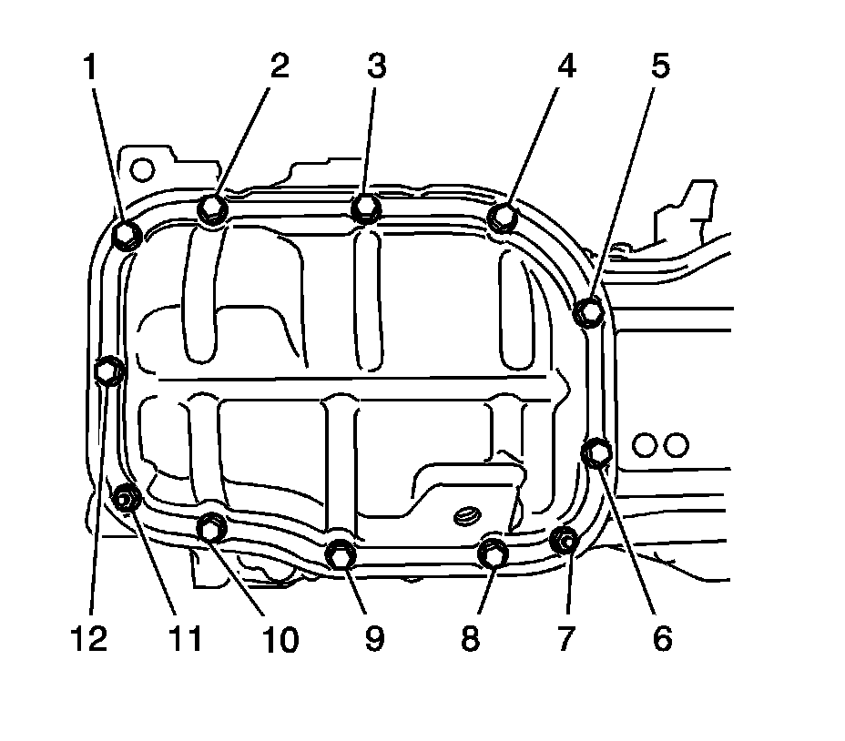 4. Install the No. 2 oil pan with the 10 bolts (1-6, 8-10, 12) and 2 nuts (7, 11) and tighten to 10 Nm (7 lb ft).
