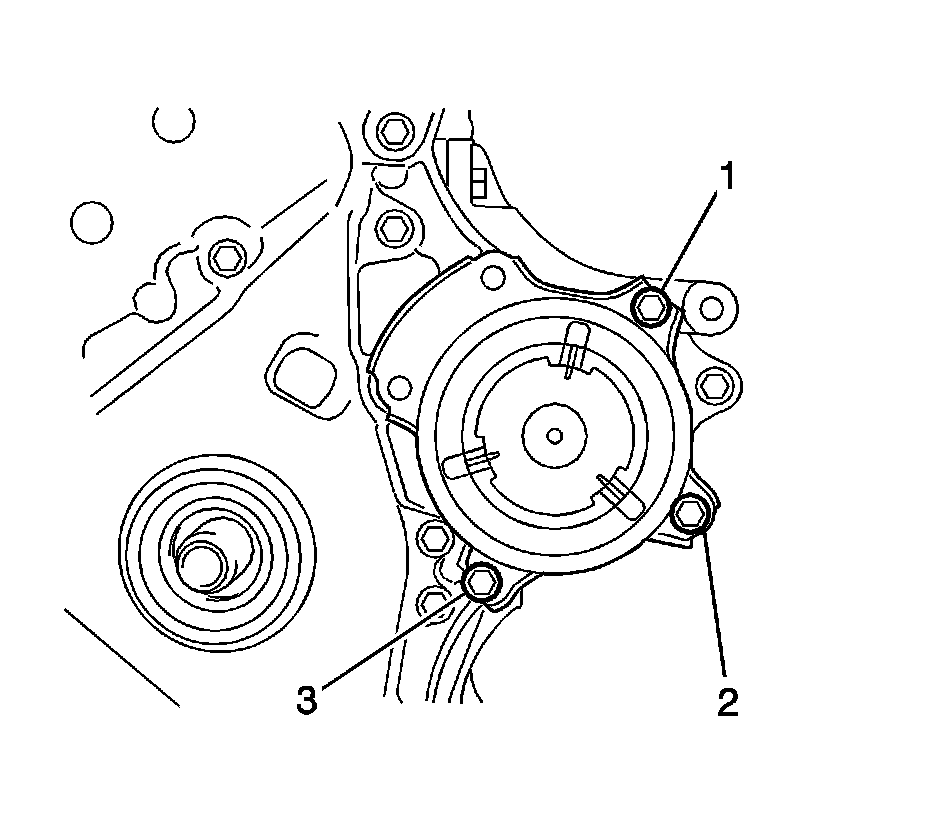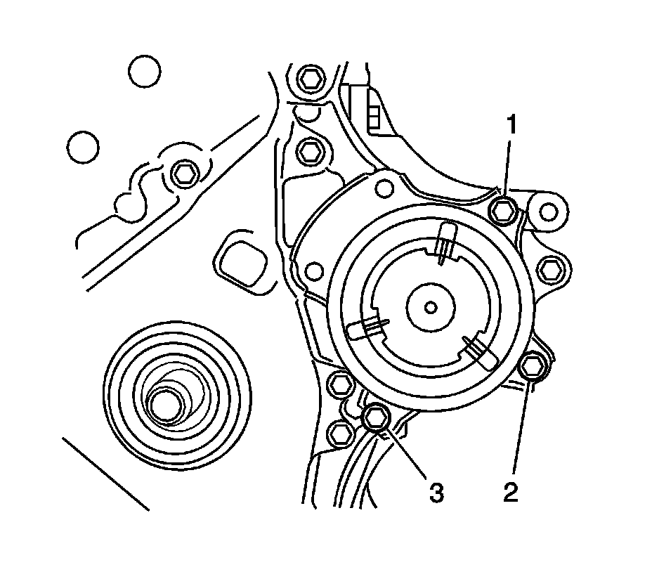 24. Install the water pump with the 3 bolts (1, 2, 3) and tighten to 24 Nm (18 lb ft).