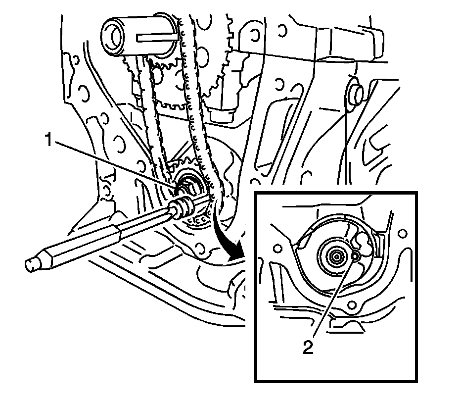38. Insert a pin punch (3 mm) into the adjusting hole (2) of the oil pump drive shaft sprocket (1) to lock the gear in position, and then remove the nut.