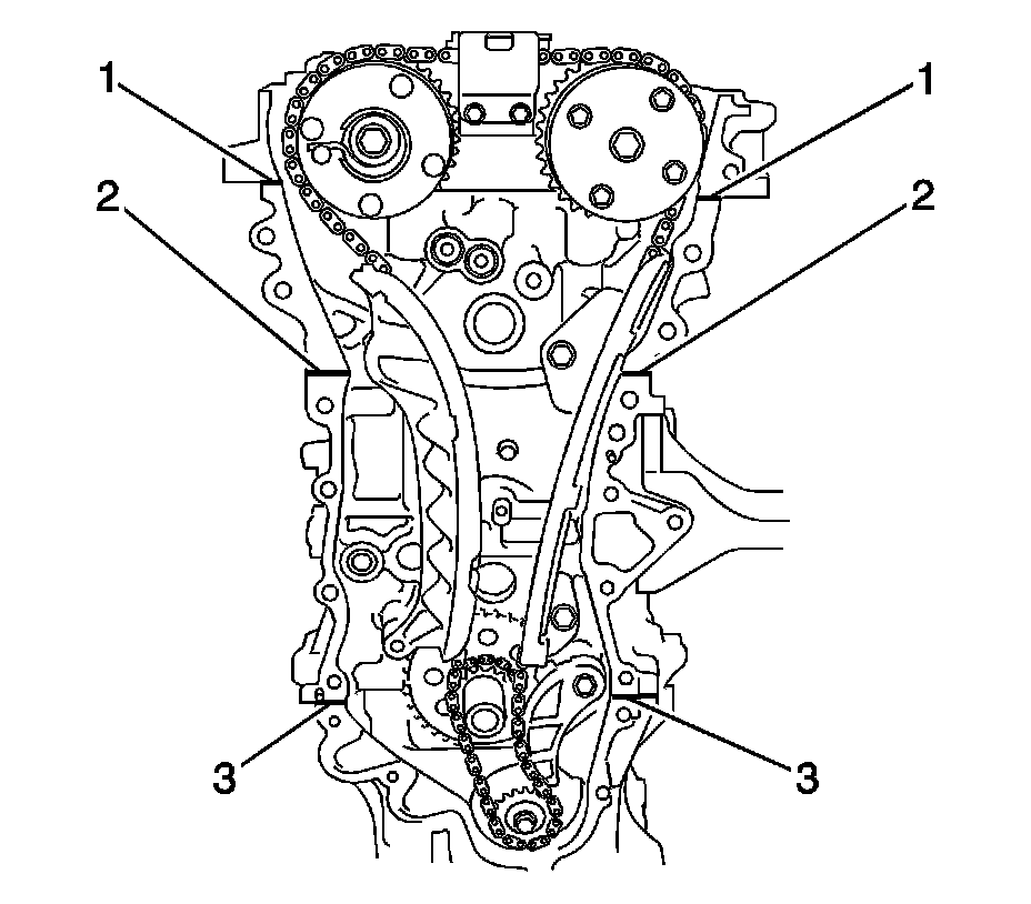 20. Apply Three Bond 1217B, or equivalent, GM part number 12378521 (Canadian part number 88901148) to the parting lines of the camshaft housing (1), cylinder head (2) and lower crankcase (3)
