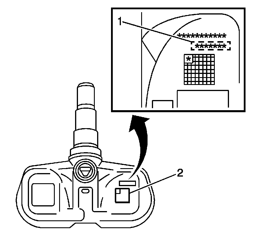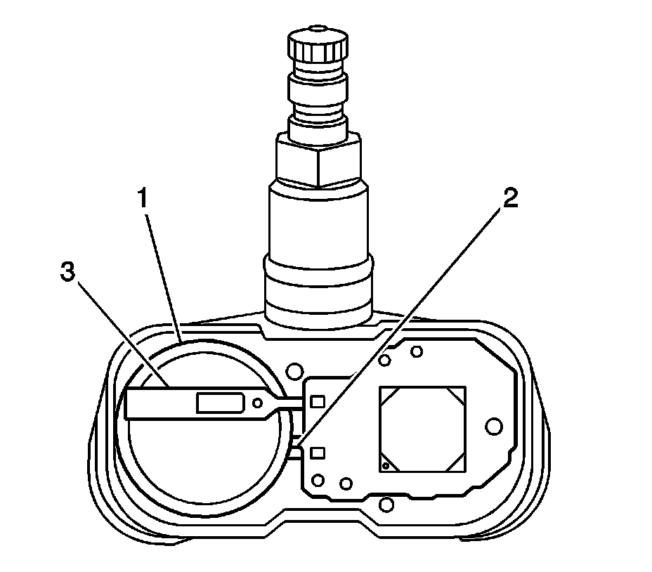 3. Install the sensor to the valve stem hole in the wheel. Insert the sensor from the inside of the wheel toward the outside of the wheel. Ensure the printed surface (2) is visible.